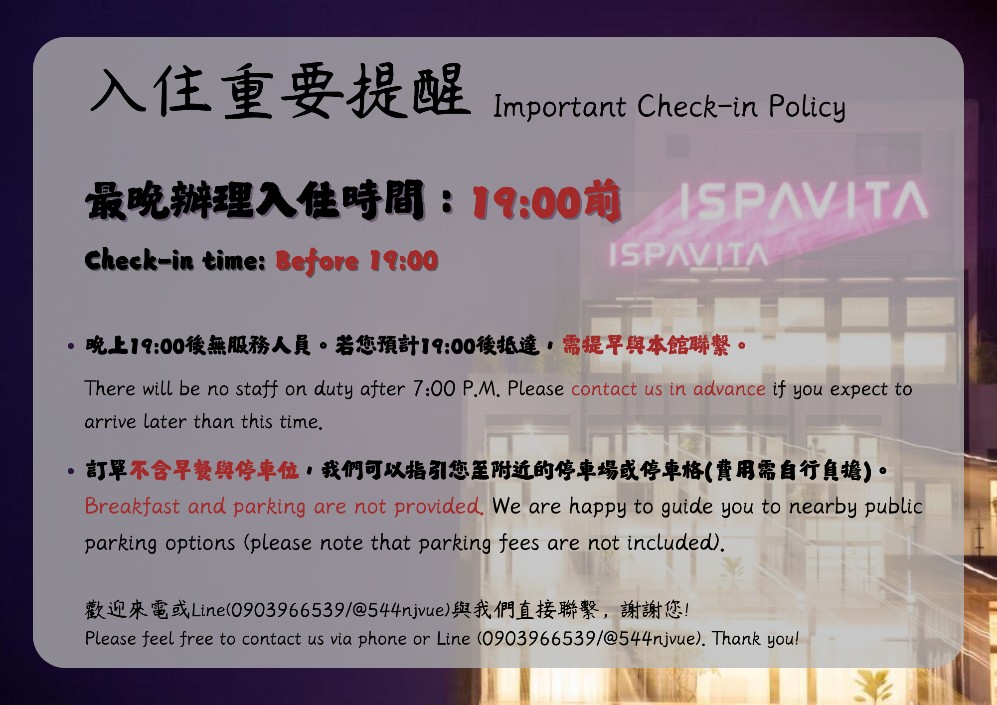※目前於本館預訂房無早餐及無車位提供,請您見諒!